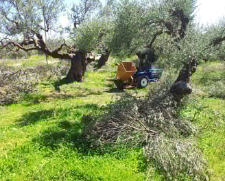 Keep in mind that by pruning, we are taking a substantial amount of nutrients away from the tree. We try to return a percentage of those nutrients back to the tree, by running the pruned branches through a wood chipper. The resulting trimmings are then spread on the ground and mixed with the soil by tilling, acting in essence as fertiliser.